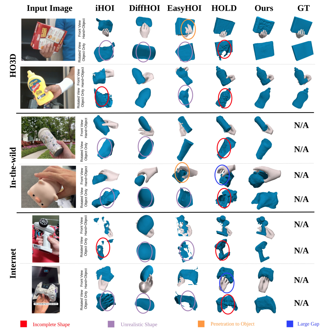 - Casual monocular video(TikTok, Instagram Reels, YouTube Shorts 등 인터넷 영상)에는 손–물체 상호작용이 풍부하지만, hand-induced occlusion / object self-occlusion / 제한된 viewpoint 등 때문에 object의 전체 geometry가 관측되지 않음. 따라서, 기존 3D reconstruction 방법들이 실패하거나 심각한 artifact 발생.