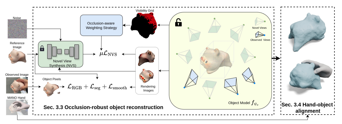 - short monocular video sequence에서 3D hand-object recon을 하는데에 NVS diffusion prior를 사용