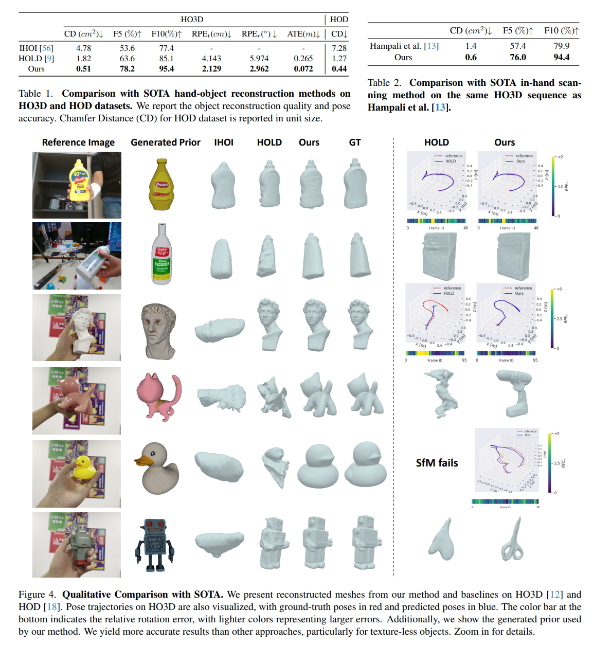 - 기존 hand-held object reconstruction 방법들은 dynamic scene이나 texture-less / thin object 를 recon하는데 어려움을 겪음