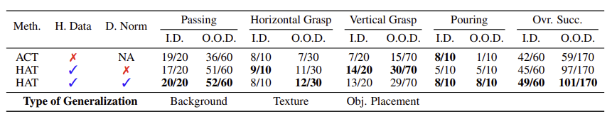 - HAT: ACT와 동일한 architecture. 하지만 state encoder는 unified state-action space. robot + human co-training. 각 task마다 250–400 robot demonstrations로 checkpoint 학습