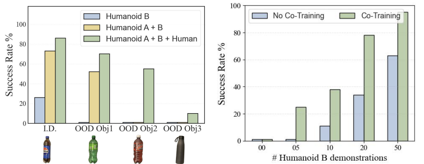 - Humanoid B에서 few-shot 실험 수행 (Humanoid A와 다른 embodiment + 다른 환경)